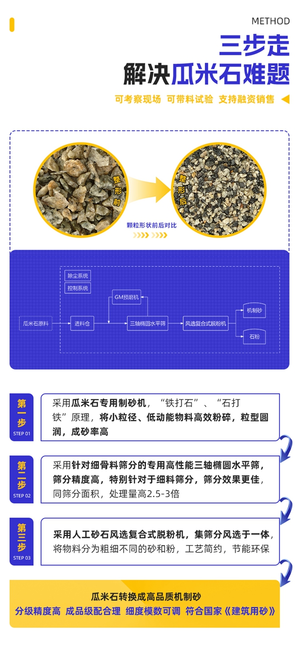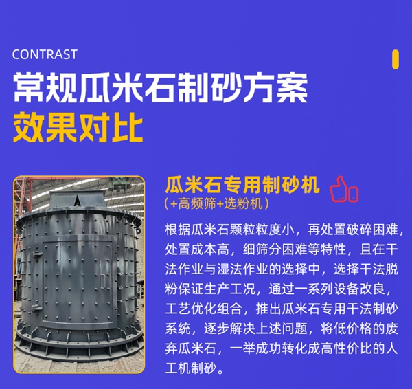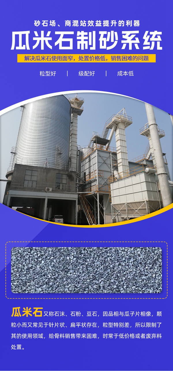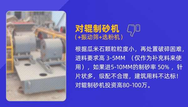 根据瓜米石颗粒粒度小,再处置破碎困难,进料要求高3-5MM(仅作为补充料来使用),如果进5-10MM的制砂率50%,针片状多,级配不合理,建筑用料不达标,对辊制砂机投资高80-100万。
