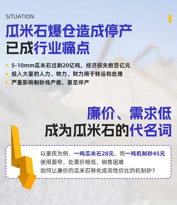 瓜米石又称石沫、石粉、豆石,因品相与瓜子片相像,颗粒小而又常见于针片状、扁平状存在,粒型特别差,所以限制了其的使用领域,给骨料销售带来困难,时常于低价格或者废弃料处置。