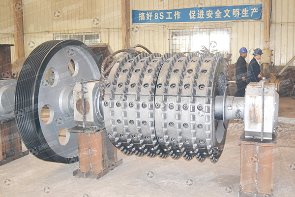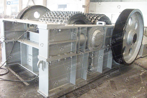 双齿辊式破碎机由传动装置、机架部分、破碎辊、液压推力装置、联动机构组成,两辊轮之间装有楔形或垫片调节装置,楔形装置的顶端装有调整螺栓,当调整螺栓将楔块向上拉起时,楔块将活动辊轮顶离固定轮,即两辊轮间隙变大,出料粒度变大,当楔块向下时,活动辊轮在压紧弹簧(或压紧油缸)的作用下两轮间隙变小,出料粒度变小。垫片装置是通过增减垫片的数量或厚薄来调节出料粒度大小的,当增加垫片时两辊轮间隙变大,当减少垫片时两辊轮间隙变小,出料粒度变小。