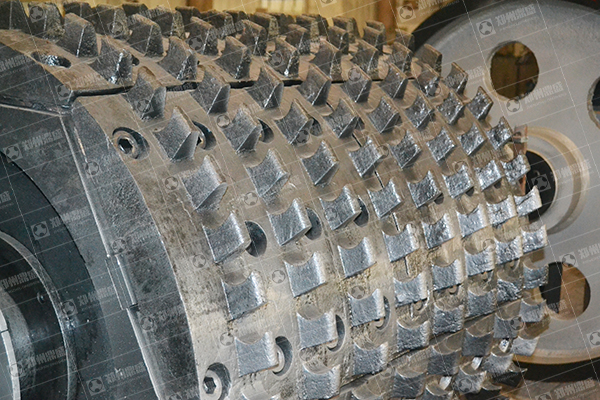 每组齿辊由六块月牙形的破碎齿板、通过高强度螺栓与辊轴上的固定架联接而成,破碎齿板采用高强度、高强度耐磨合金铸钢铸钢制造,齿部表面经渗碳、氮化处理渗透深度>3mm,具有可靠的耐磨性能和高强度的抗冲击性能,连续使用寿命达20000小时以上,齿板磨损后便于更换。