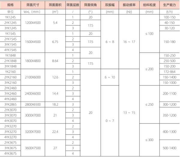 YK圆振动筛介绍:YK圆振动筛为圆形轨迹运动,是一种多层数,新型高效振动筛。是专门为采石场筛分料石设计的,也可供选煤、选矿、建材、电力及化工部门等作产品分级用,YK(F)系列为国内新型机种,该机采用块偏心激振器及轮胎联轴器,具有结构先进、激振力强、振动噪音小、易于维修、坚固耐用等特点。