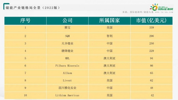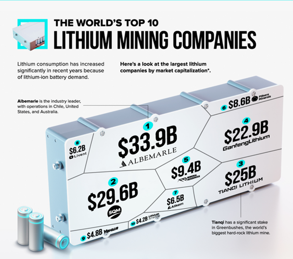 按市值划分,世界上较大的锂生产商是美国Albemarle(雅宝),市值达339亿美元。Albemarle Corporation与智利第二大生产商Sociedad Químicay Minera de Chile (SQM)合作,在智利的Salar de Atacama开展锂矿开采业务。Salar de Atacama自1980年代以来便一直从事锂矿的开采生产,目前占据了全球近四分之一的锂矿产量。