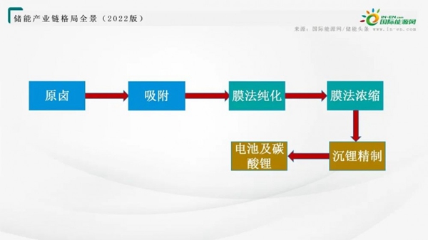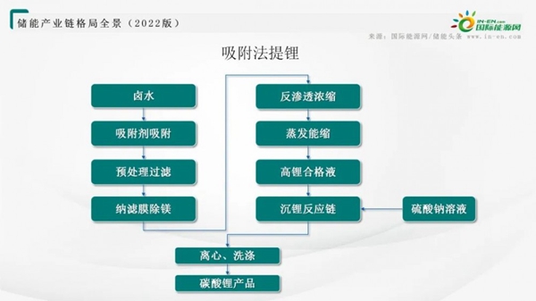 通过对锂有选择性的吸附剂吸附卤水中的锂,再用淡水解吸与其他杂质分离并富集,再通过小型盐田浓缩后化学沉淀锂。