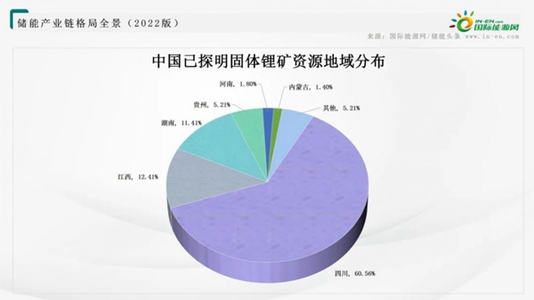 矿石锂资源分布于四川、江西、湖南、新疆等省份,存储量约为全国锂资源存储量的20%左右,其中四川省的储量较大,占全国矿石锂资源储量的60%左右。