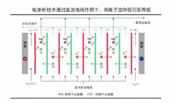在外加直流电场的作用下,固态或液态离子交换膜对水中离子具有选择性,使水中的一部分离子透过交换膜转移到另一部分水中,从而达到分离镁、浓缩锂的目的。其优势在于可处理高镁锂比盐湖、效率高;难点在于开发具有优选择性、高锂容量和高稳定性的锂捕获材料。