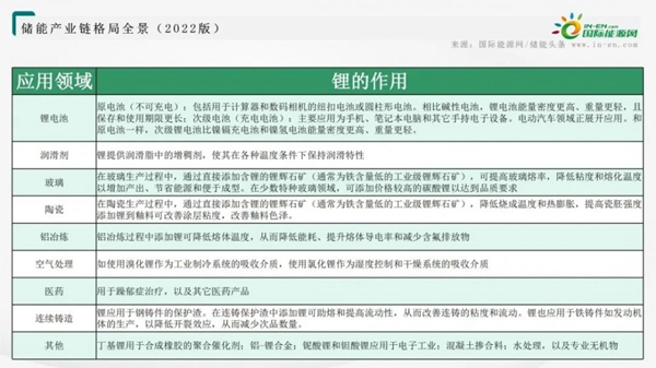 在传统领域,锂可以用于生产新型合成橡胶、新型工程材料、陶瓷和稀土冶炼等,被誉为“工业味精”;而今,锂又被称为“白色石油”,因为其在新能源领域,是锂离子电池主要的原材料,是电池和电源领域无可争议的较佳元素,被称为“能源金属”;在医药领域,锂是生产他汀类降脂药和新型抗病毒药等新药品的关键中间体。
