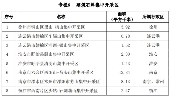 (二) 建筑石料集中开采区在徐州、连云港、淮安、南京、镇江和常州等资源有保障、 开发有基础的地区划定 8 个建筑石料集中开采区,力争形成数个年生产规模在 500 万吨以上的建筑石料开采基地。落实国土空间规划管控要求,鼓励引导集约化、规模化开采建筑石料。建筑石料集中开采区内矿山必须按照绿色矿山标准要求建设。