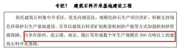 《规划》强调长江经济带、长三角区域一体化发展等国家发展战略实施,新型工业化、新型城镇化的推动以及大量基础设施建设,对矿产资源的需求仍将维持在高 位。砂石资源供需矛盾突出,要统筹实施国家战略性矿产和江苏重要矿产的勘查开发,保持一定规模的矿产开采总量,提高矿产资源保障能力,规模化开采建筑石料,满足经济社会发展需求。