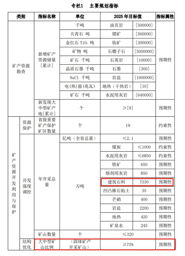 (一)在矿产资源开发利用与保护方面,规划共划定13个重点开采区、8个建筑石料集中开采区和19个省级重要矿产保护矿区。提出2025年全省开采总量预期在2.1亿吨以内、矿山数预期在320个以内的开发强度调控目标。确定10个主要调控矿种,其中煤炭、水泥用灰岩等2个矿种年开采总量定为约束性指标,铁矿、熔剂用灰岩、建筑石料、凹凸棒石粘土、岩盐、芒硝、地热、矿泉水等8个矿种年开采总量定为预期性指标。鼓励引导矿山规模化开采,优化大中型矿山比例。2025年,全省固体矿产大中型矿山比例预期在75%以上。