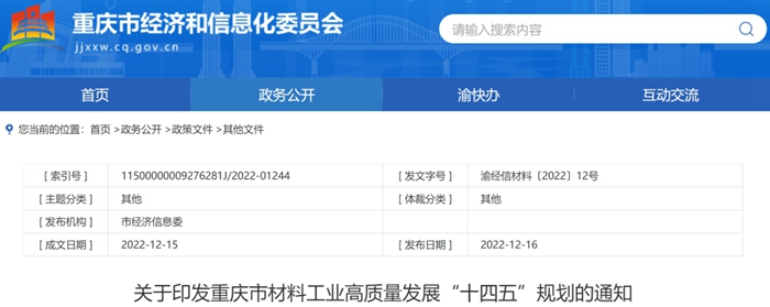 近日,重庆市经信委发布了《关于印发重庆市材料工业高质量发展“十四五”规划的通知》。