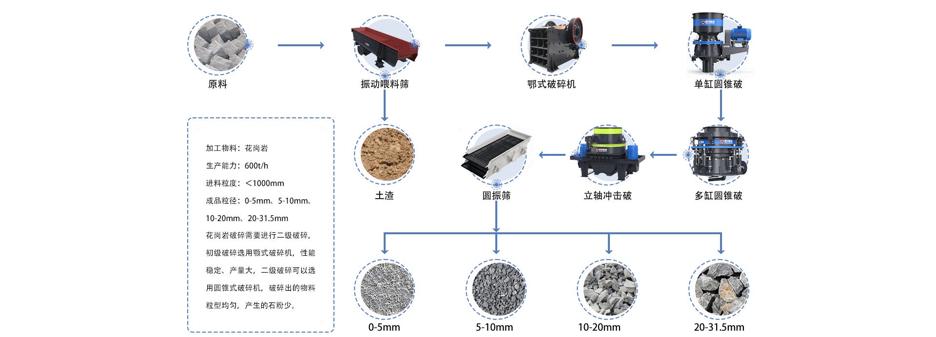 河卵石、花岗岩、玄武岩、铁矿石、石灰石、石英石、煤矸石、建筑垃圾等
